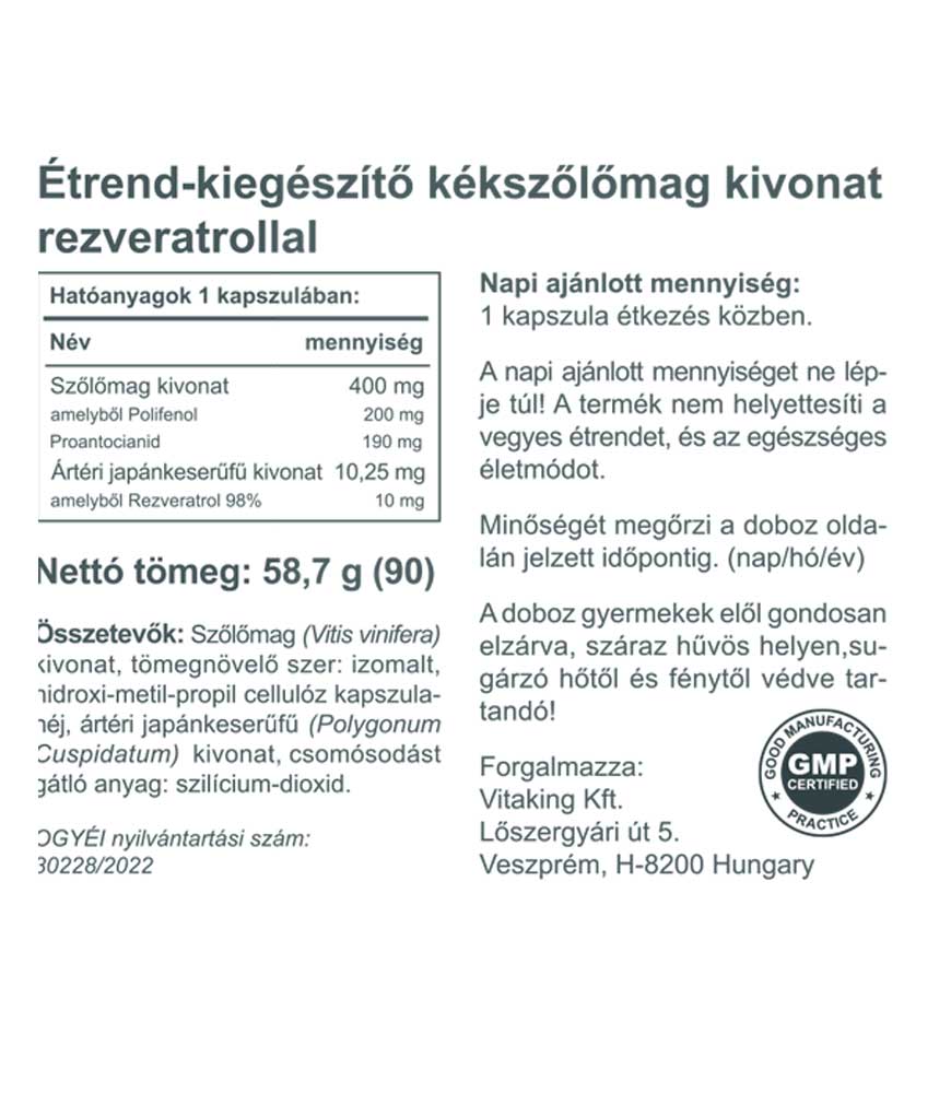 Szőlőmag (Vitis vinifera) kivonat, tömegnövelő szer: izomalt, hidroxi-metil-propil cellulóz kapszulahéj, ártéri japánkeserűfű (Polygonum Cuspidatum) kivonat, csomósodást gátló anyag: szilícium-dioxid.