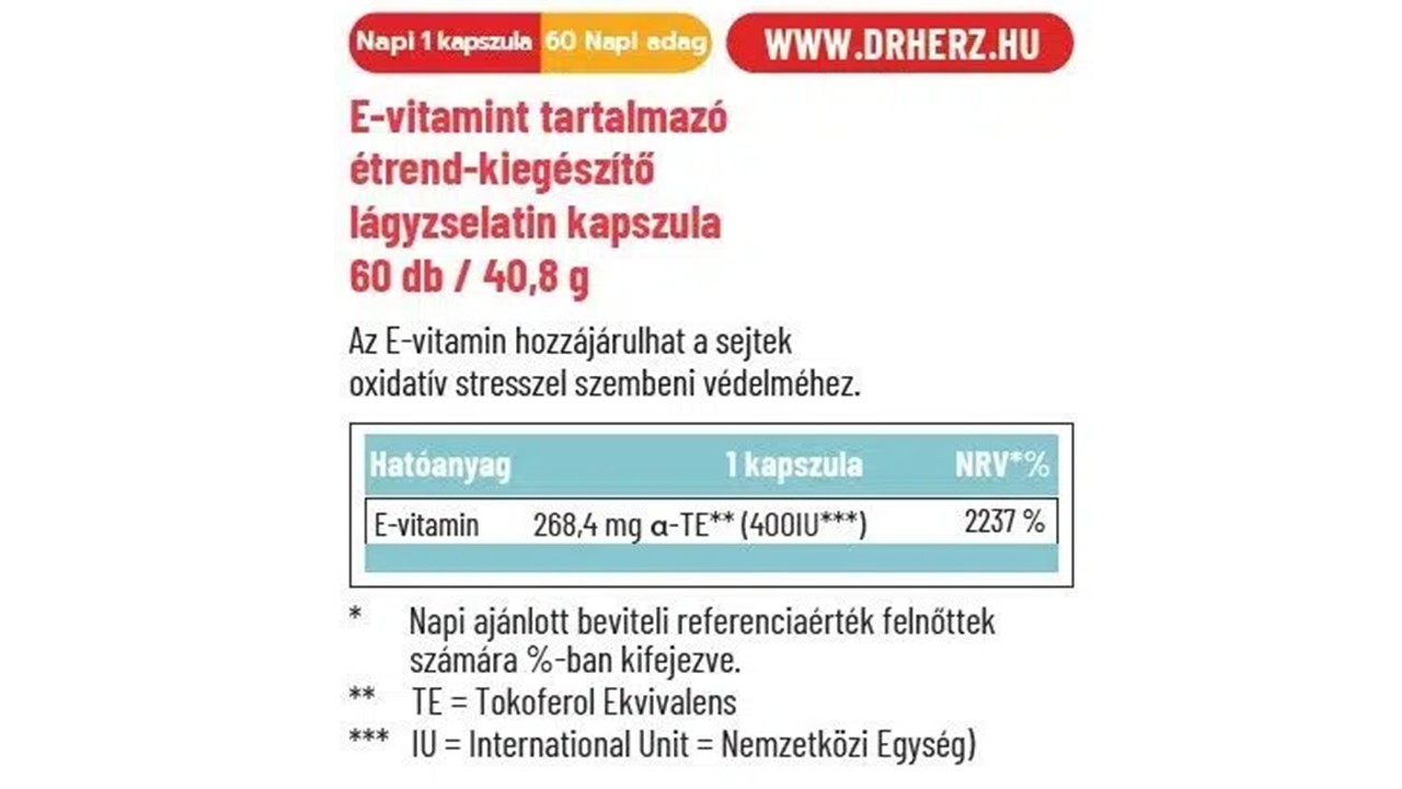 Természetes E-vitamin készítmény, magas, kapszulánként 400IU (268,4 mg) hatóanyag tartalommal.