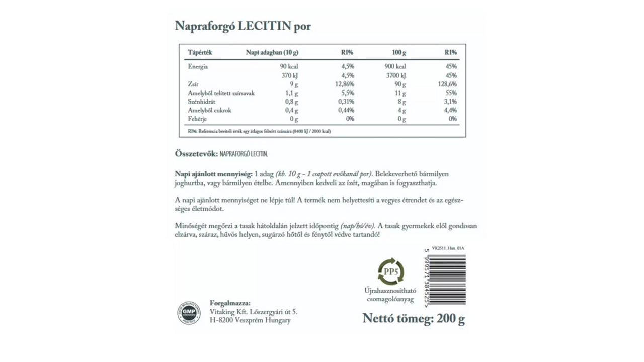 A lecitin a sejtek egyik fontos építőeleme. Természetes forrása azoknak a foszfolipideknek, amelyek alkotóelemei az agysejtek és az idegsejtek membránjainak. A Vitaking Napraforgó Lecitin por 100%-ban napraforgóból származik, GMO-mentes, szójától mentes, így ideális választás azoknak, akik érzékenyek a szójára.