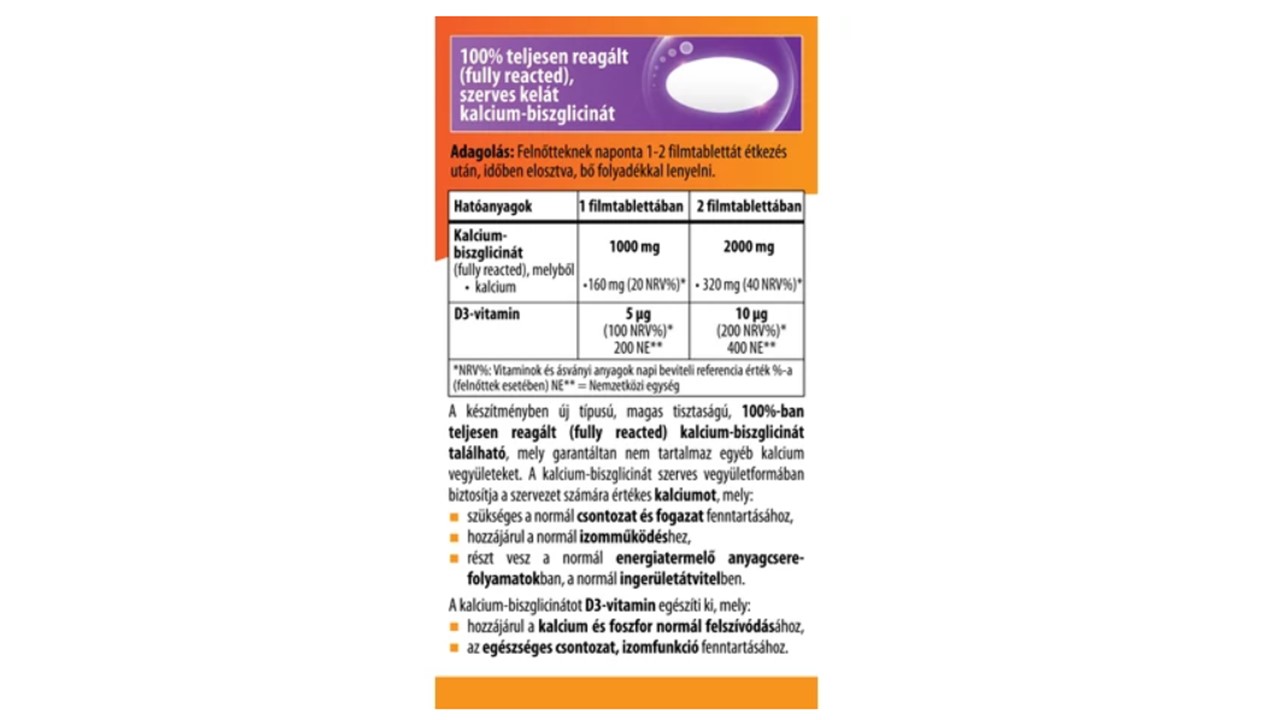 Teljesen reagált kalcium-biszglicinátot és D3-vitamint tartalmazó étrend-kiegészítő filmtabletta