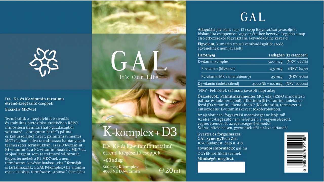 Termékünk a megfelelő felszívódás és stabilitás biztosítása érdekében RSPO-minősítésű (fenntartható gazdaságból származó, „orangután-barát”) pálma- és kókuszolajból nyert MCT-olajban oldva tartalmazza hatóanyagait természetes formájukban, azaz D3-vitamint, K1-vitamint és a K2-vitamin bioaktív MK-7-es szója allergént sem tartalmazó változatát. (Egyes termékek a K2 MK-7-nek a nem természetes, kevésbé hatásos „cisz-” formáját is tartalmazzák, a GAL K-komplex + D3 csak a hatásos, természetes „transz-” formáját.)