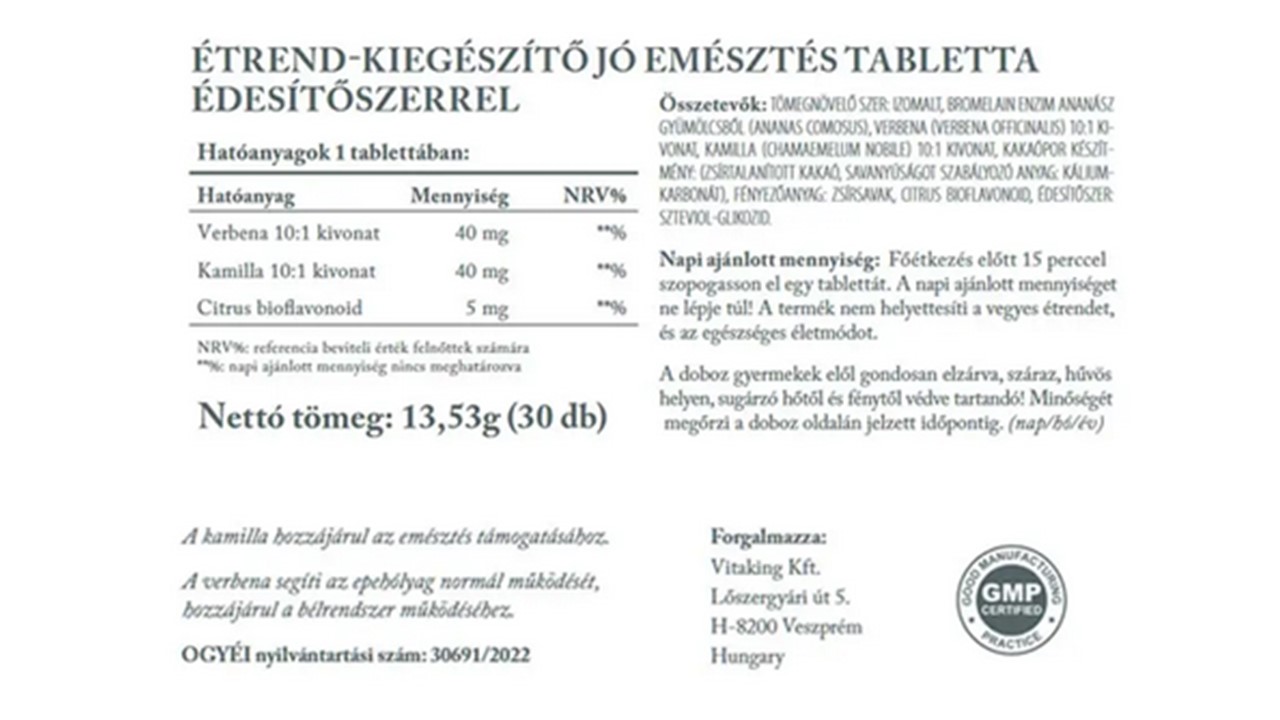 Tömegnövelő szer: izomalt, bromelain enzim ananász gyümölcsből (Ananas comosus), verbena (Verbena officinalis) 10:1 kivonat, kamilla (Chamaemelum nobile) 10:1 kivonat, kakaópor készítmény: (zsírtalanított kakaó, savanyúságot szabályozó anyag: kálium-karbonát), fényezőanyag: zsírsavak, citrus bioflavonoid, édesítőszer: szteviol-glikozid