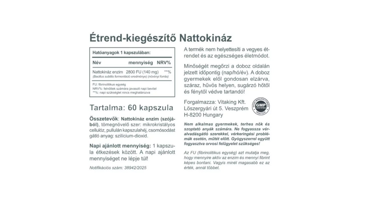 A Vitaking Nattokináz természetes fermentációval (Bacillus subtilis fermentáció) ) előállított enzim amelynek aktivitása 2800 FU kapszulánként.