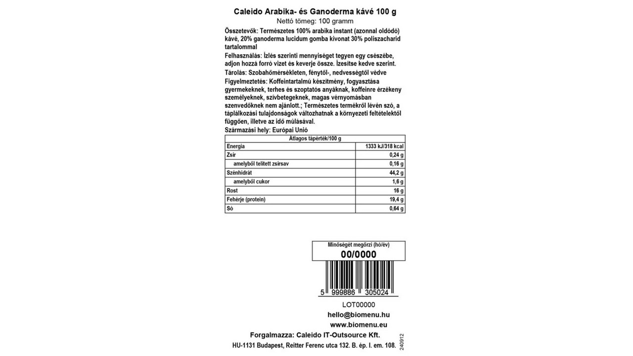 Természetes 100% arabika instant (azonnal oldódó) kávé, 20% ganoderma lucidum gomba kivonat 30% poliszacharid tartalommal