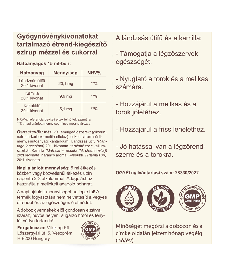 Méz, víz, emulgeálószerek: (glicerin, nátrium-karboxi-metil-cellulóz), cukor, citrom sűrítmény, sűrítőanyag: xantángumi, Lándzsás útifű (Plantago lanceolata) 20:1 kivonata, tartósítószer: kálium-szorbát, Kamilla (Matricaria recutita (M. chamomilla)) 20:1 kivonata, narancs aroma, ás Kakkukfű (Thymus sp) 20:1 kivonata.