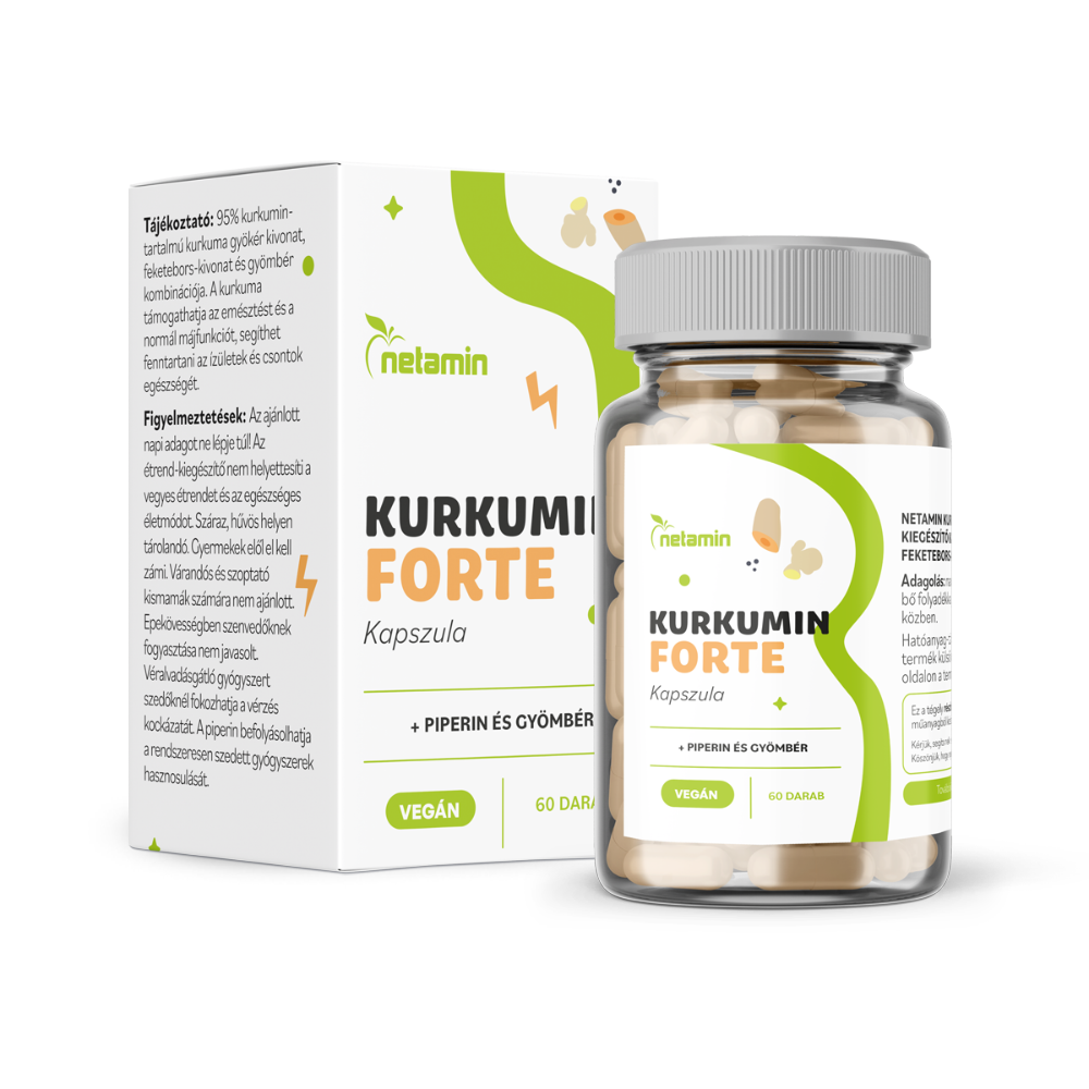 A kurkuma aktív hatóanyaga a kurkumin, a legtöbb pozitív tulajdonság hátterében, amit a kurkumának tulajdonítunk, ez a hatóanyag áll. A Netamin Kurkumin FORTE magas hatóanyag-tartalommal és kiemelten jó biológiai hasznosulással rendelkezik. A napi adagban (1 kapszula) 300 mg 95% kurkuminra standardizált kurkuma-kivonat található, kiegészítve piperinnel és gyömbérrel.