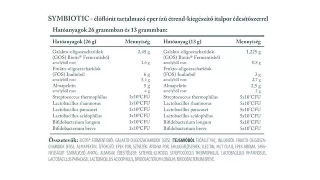 Biotis® Fermentisből galakto-oligoszacharidok (GOS) (Tejsavóból előállítva), Inulinból frukto-oligoszacharidok (FOS), almapektin, ízfokozó: eper por, színezék: áfonya por, emulgeálószerek: (lecitin, MCT olaj), eper aroma, savanyúságot szabályozó anyag: almasav, édesítőszer: szteviol-glikozid, streptococcus thermophilus, lactobacillus rhamnosus, lactobacillus paracasei, lactobacillus acidophilus, bifidobacterium longum, bifidobacterium breve