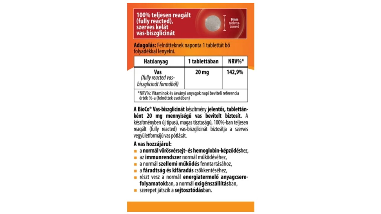 A BioCo® Vas-biszglicinát készítmény jelentős, tablettánként 20 mg mennyiségű vas bevitelt biztosít.