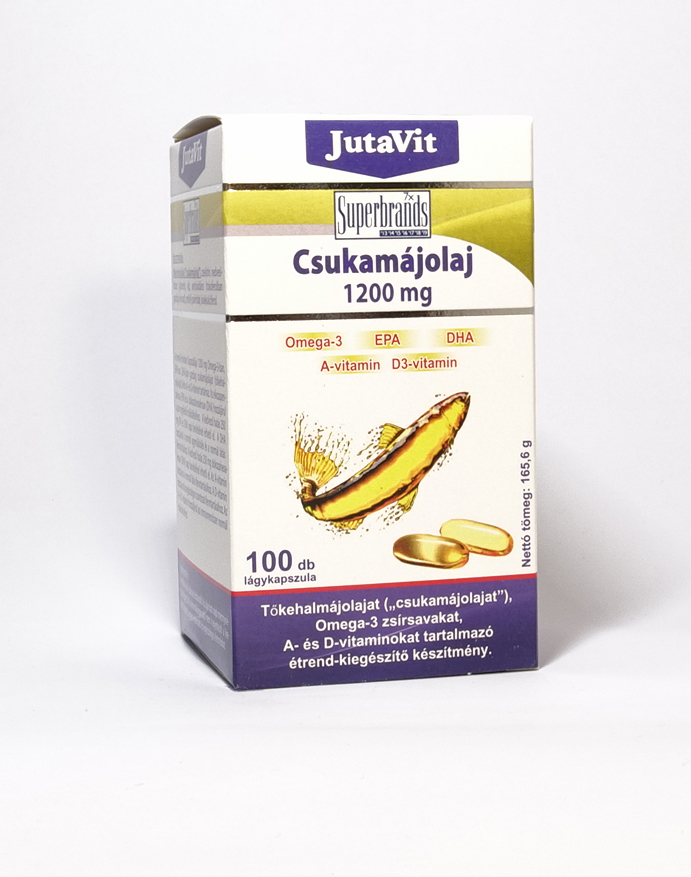 JutaVit Csukamájolaj 1200 mg, tőkehalmájolajat („csukamájolajat”), Omega-3 zsírsavakat, A- é D-vitaminokat tartalmazó étrend-kiegészítő készítmény.
