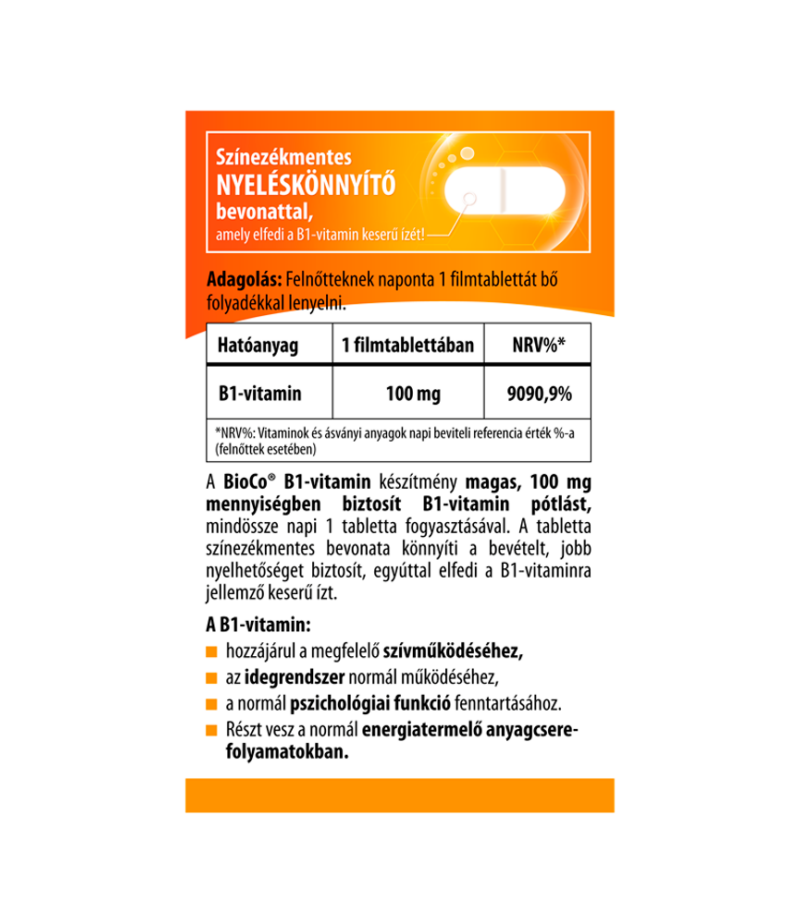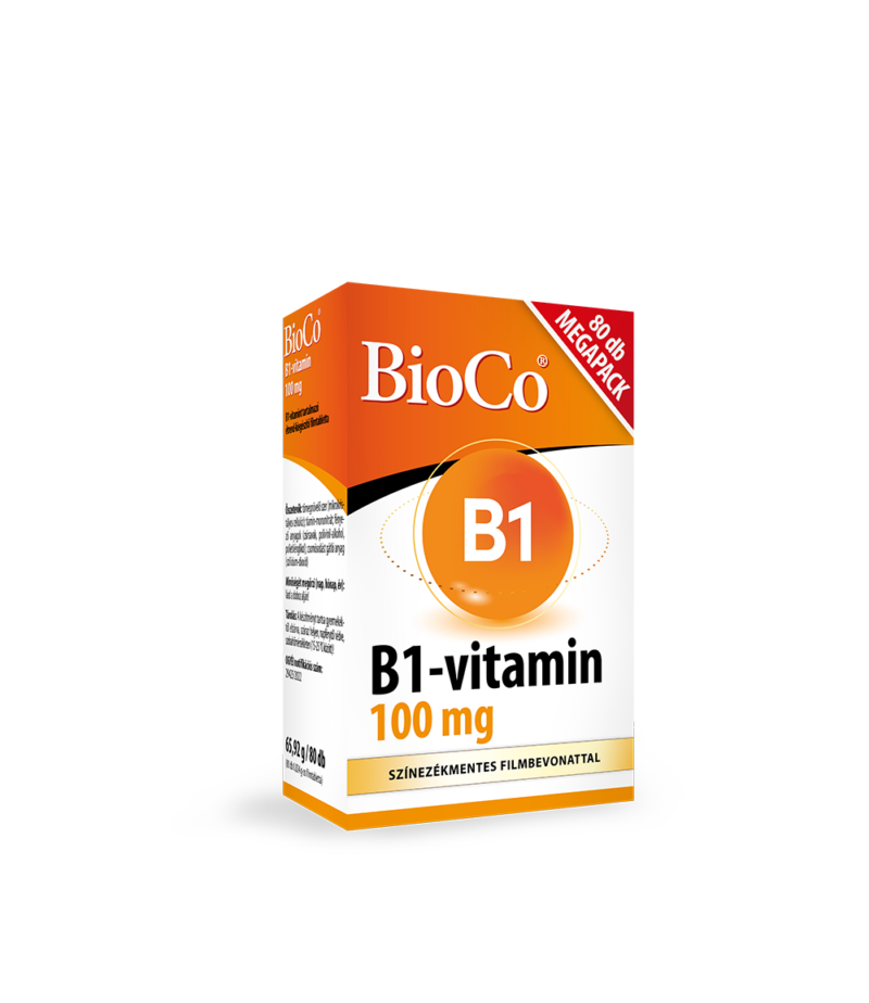 A BioCo® B1-vitamin készítmény magas, 100 mg mennyiségben biztosít B1-vitamin pótlást, mindössze napi 1 tabletta fogyasztásával.